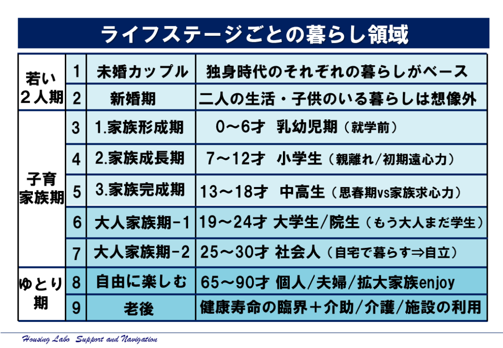 と、子育て期間の仕上期である「家族完成期」「大人家族期」までは、概ね6年単位で、ライフステージは上がり、変化して行きます。つまり住まいとは、「人生の7割以上の時間を支える器」です。
